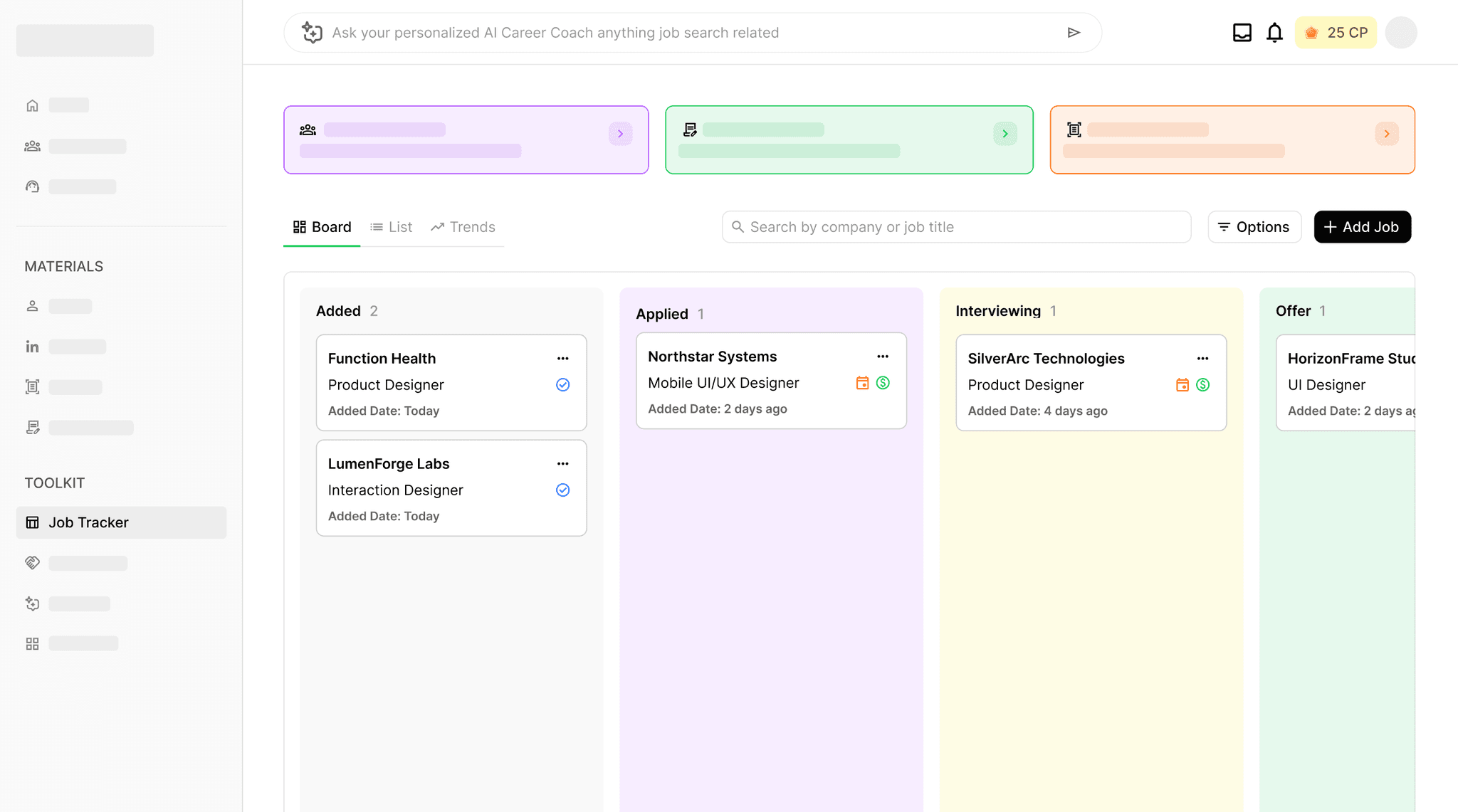 Track interview rounds, prep notes, and offer details. See conversion rates from application to offer.
