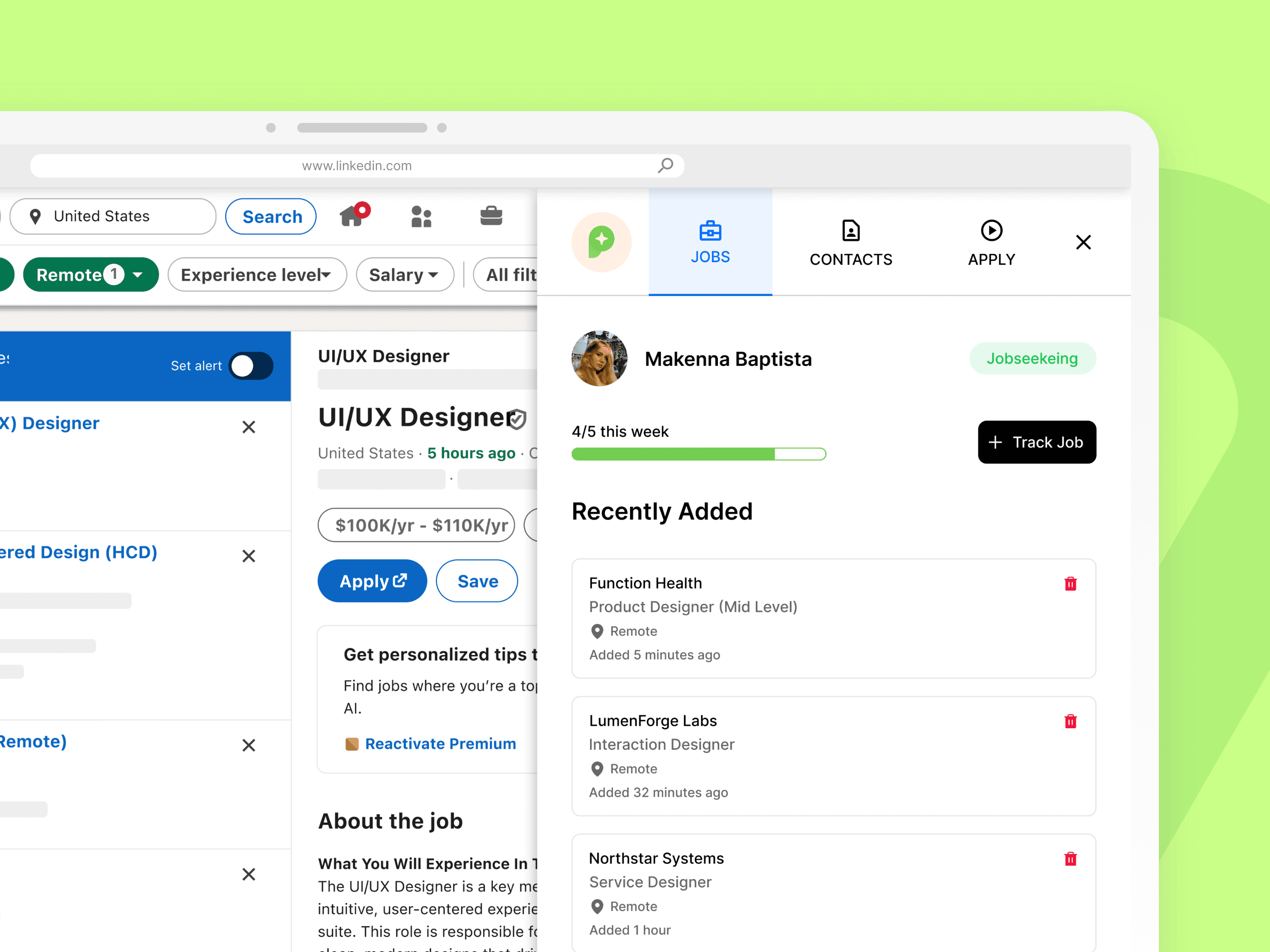 Students browse jobs on LinkedIn, job boards, or any career site. With one click of the Chrome Extension, job details automatically populate their tracker. No manual data entry. No lost opportunities.
