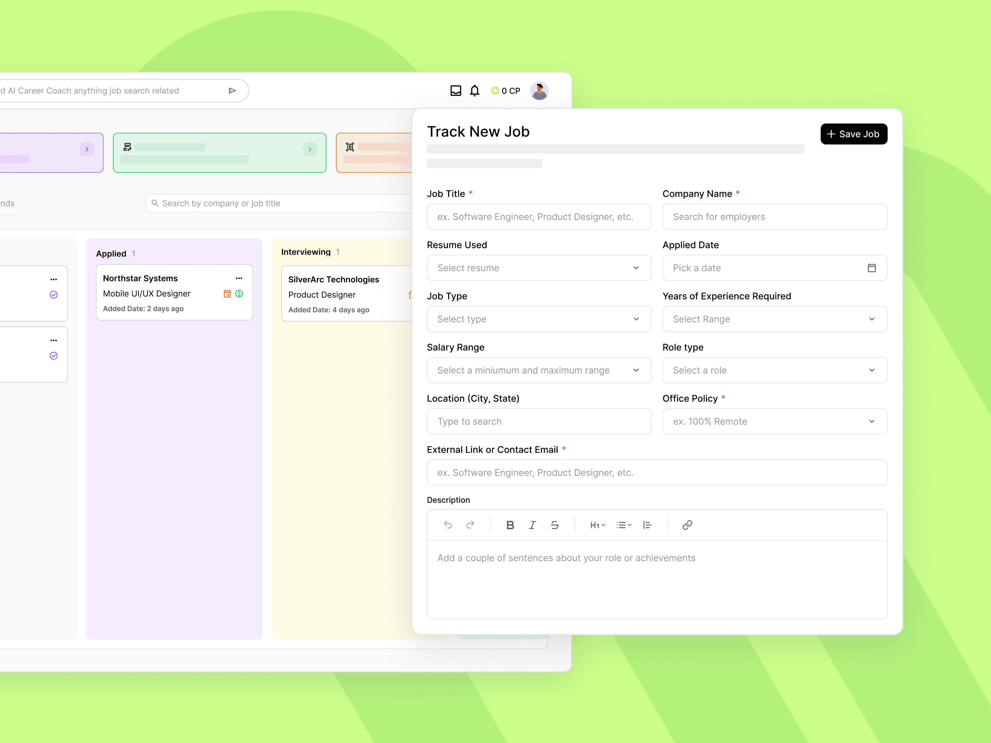Add notes, set follow-up reminders, tag applications by industry or role type.