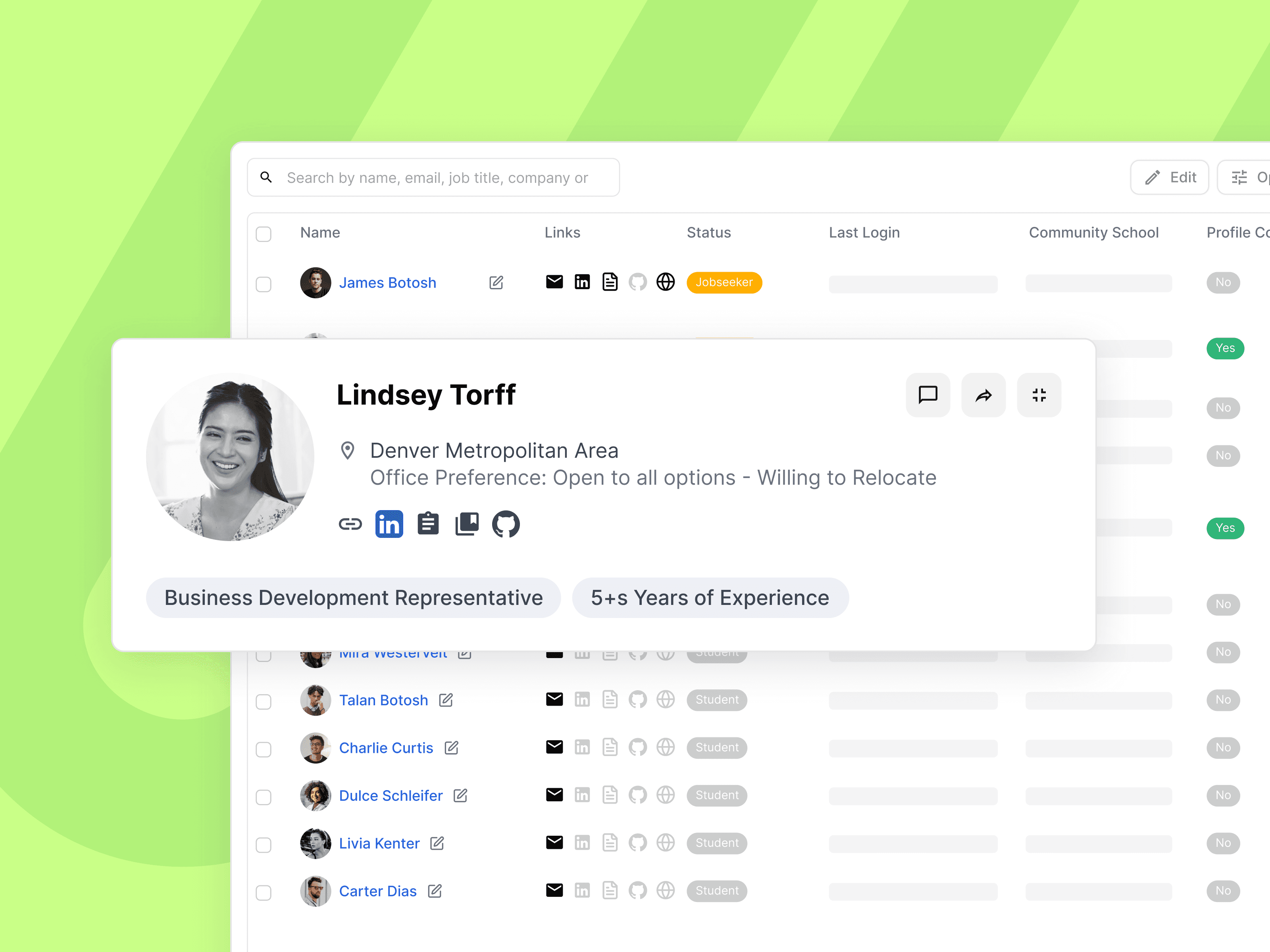 Real-time access to resumes, job search progress, LinkedIn profiles, and placement status. Customizable tags and notes. No more spreadsheets.